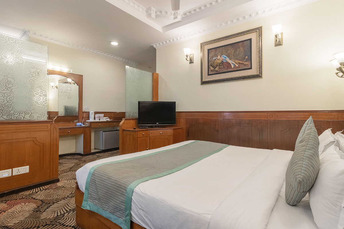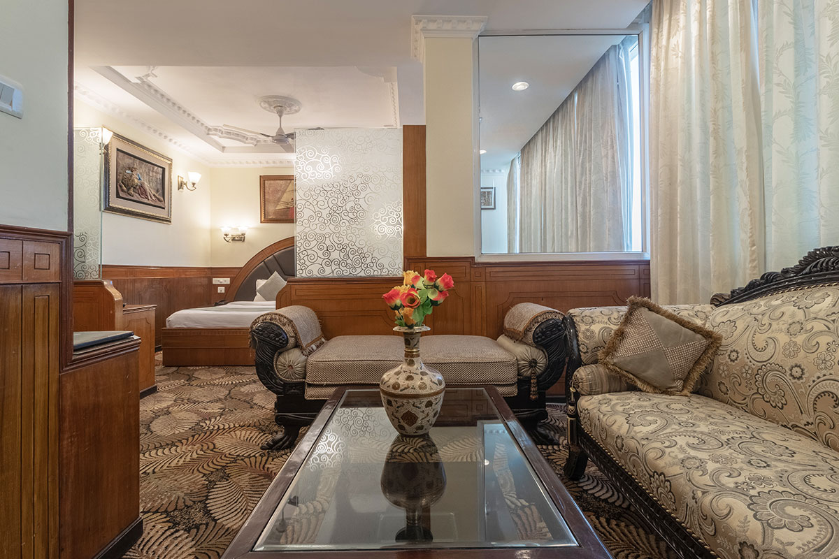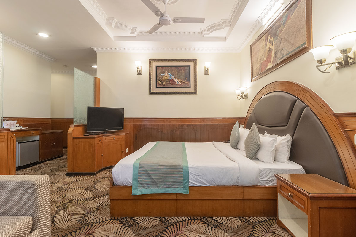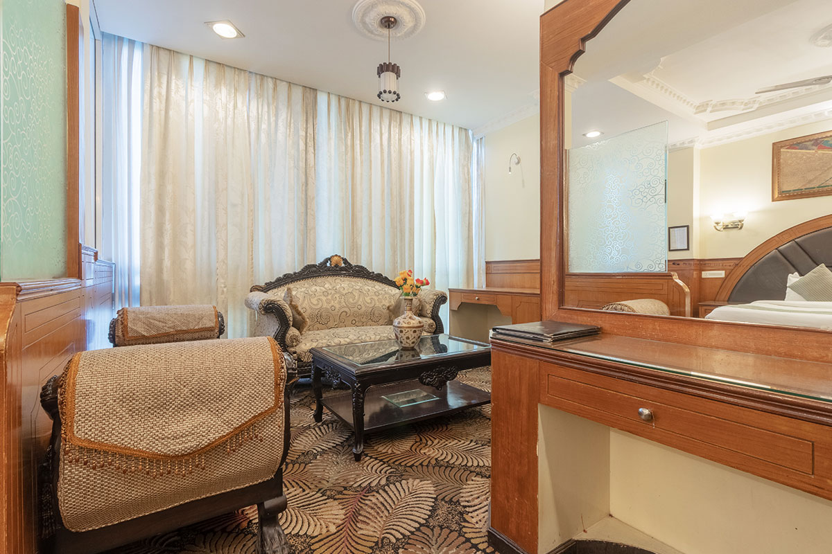 Our Presidential Room has been built to offer you the epitome of luxury. Spanning 200 sq ft of area, this premium bedroom has been made to offer our guests peace of mind while relaxing in one of the best living spaces of our hotel. From elegantly designed interiors and premium amenities to top-notch furniture and intricate woodwork, each of the settings has been designed with attention to detail ensuring you can have a splendid time while staying in this amazing living space.
